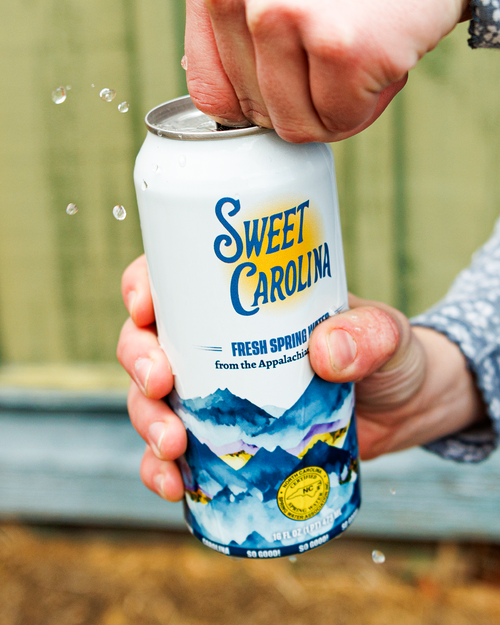 Sweet Carolina Water delivers crisp North Carolina spring water in sustainably packaged aluminum cans. Created by Appalachian State students, our mission is simple: refresh communities while protecting the environment we call home.